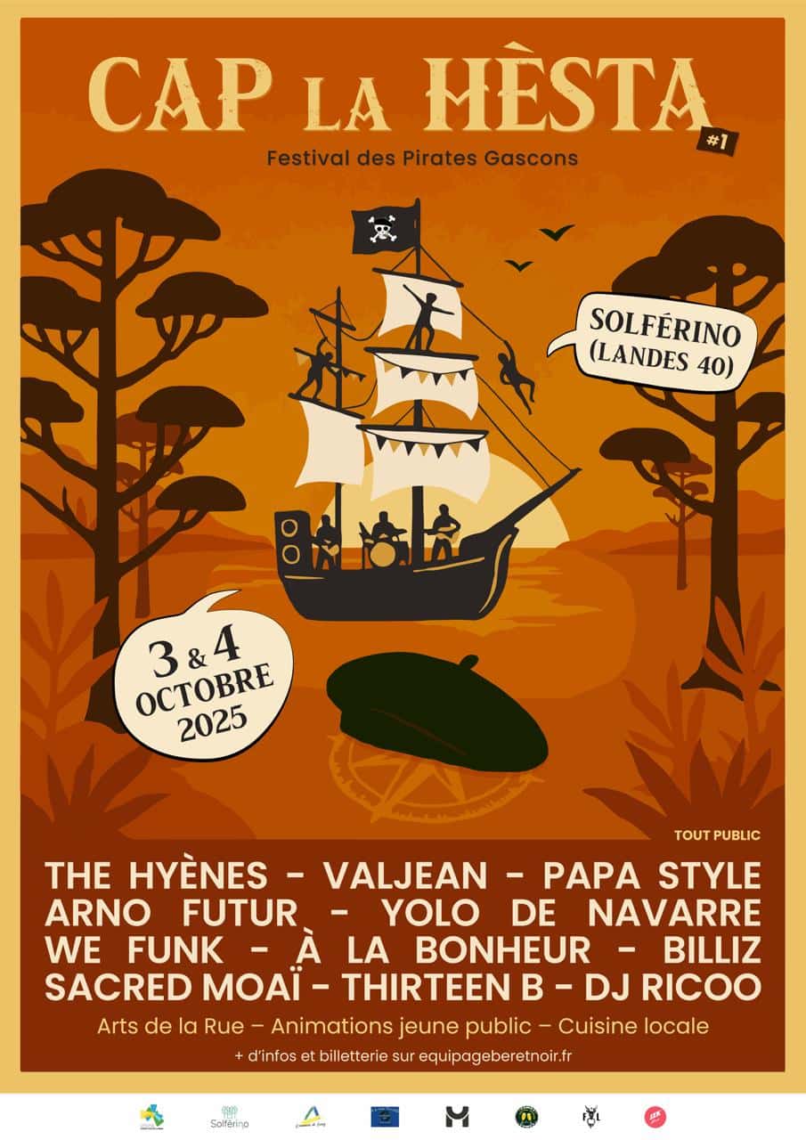 Cap sur Solférino, dans les Landes, pour un rendez-vous inédit qui promet de marquer l’automne 2025. Le Cap La Hèsta – Festival Pirate Gascon met les voiles les 3 et 4 octobre 2025 au cœur de la forêt landaise, sur le site de Cap de Pin. Derrière ce nouveau festival de musique 2025, on retrouve l’équipage du Béret Noir, déterminé à faire souffler un vent de liberté et d’audace. L’idée est simple : mélanger l’esprit pirate, l’énergie des concerts live et l’identité gasconne, pour deux jours où la fête prend des allures d’aventure.