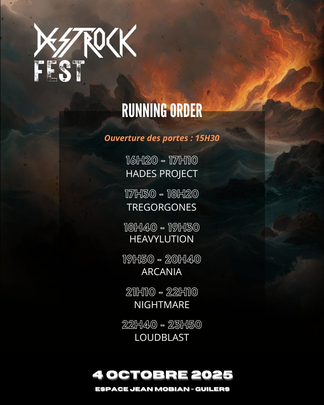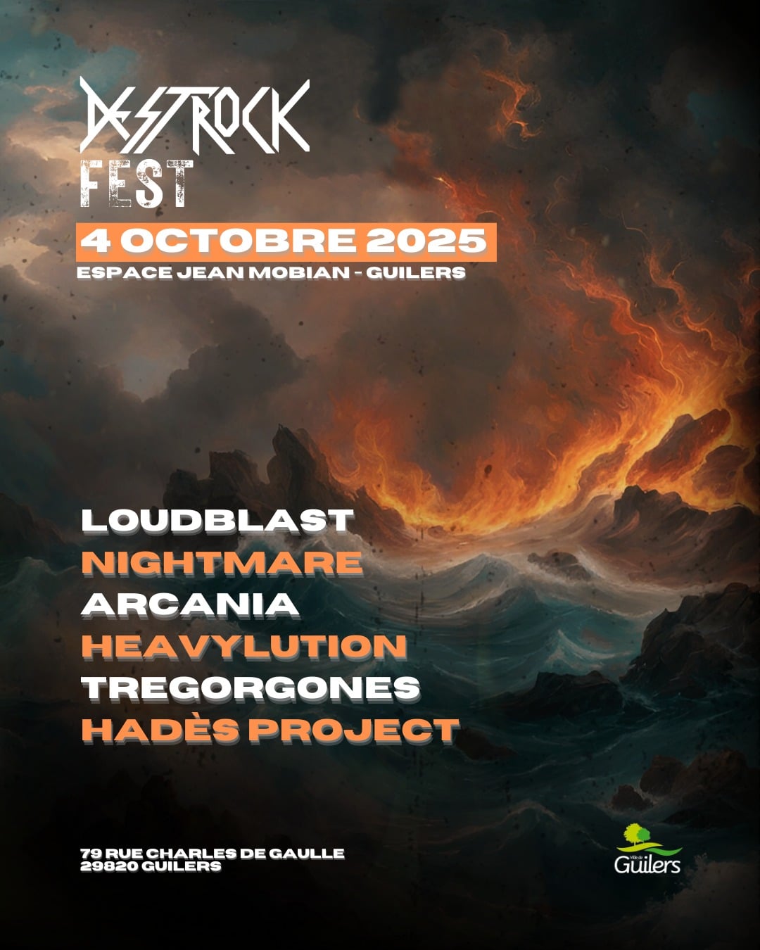 Le programme de cette édition 2025 mettra à l’honneur des groupes variés qui incarnent la diversité du metal. Loudblast, figure incontournable de la scène française, apportera toute son expérience et son intensité. Nightmare, groupe reconnu dans le heavy et le power metal, promet une prestation qui marquera le public. Arcania viendra compléter l’affiche avec son approche thrash moderne et incisive. Heavylution offrira un heavy solide et efficace, fidèle à ses influences classiques, tandis que Tregorgones mettra en avant l’énergie de la scène locale. Enfin, Hades Project complétera cette soirée avec une identité percutante, ajoutant une touche supplémentaire à ce concert metal Guilers.
