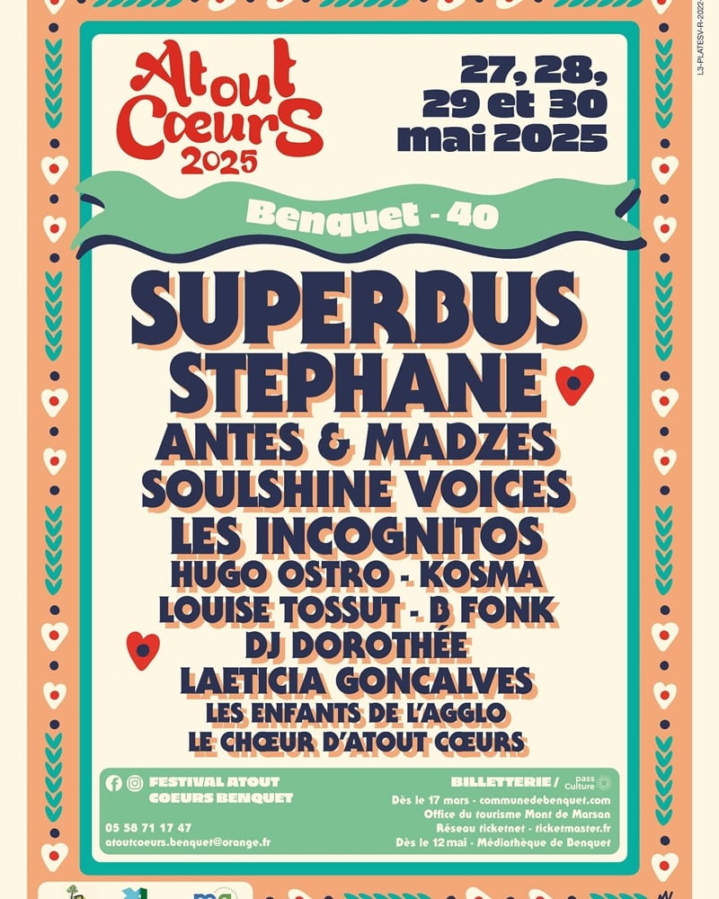 Au cœur des Landes, le Festival Atout Cœurs revient du 27 au 30 mai 2025 à Benquet , prêt à faire résonner sa programmation éclectique et festive. Chaque année, cet événement rassemble des artistes de divers horizons, offrant un mélange unique de pop, rock et musiques actuelles. Pour cette édition, le public pourra retrouver Superbus , groupe phare des années 2000, aux côtés d’artistes montants comme Stéphane et Antes & Madzes , qui apportent une touche de fraîcheur à la scène musicale française.