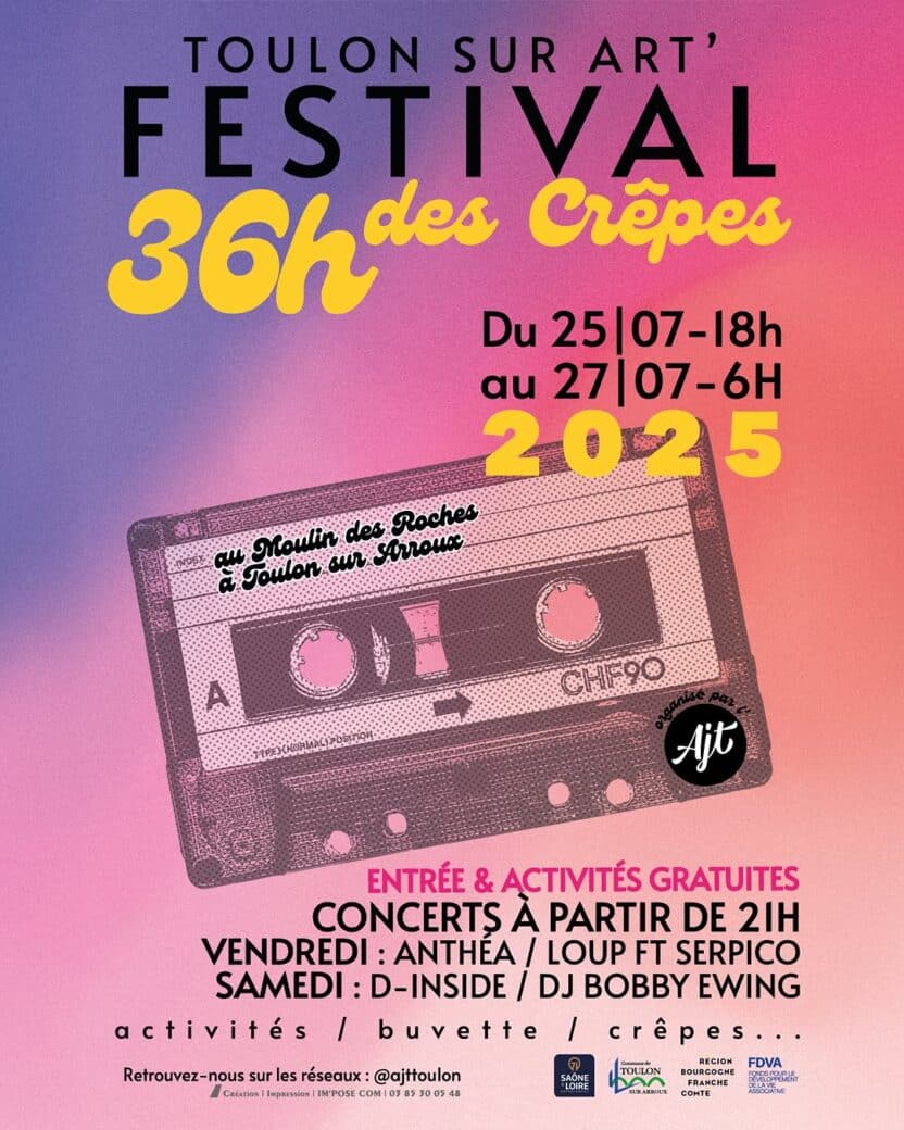 Niché au cœur du charmant village de Toulon-sur-Arroux, le festival de musique 2025 Toulon sur Arts : 36H des crêpes revient les 25 et 26 juillet pour une nouvelle édition aussi généreuse que festive. Organisé par l’AJT, l’Association de la Jeunesse Toulonnaise, ce rendez-vous gratuit séduit par son atmosphère conviviale, son esprit collectif et son attachement à une culture accessible à toutes et tous. Deux soirées de concerts sont programmées au Moulin des Roches, un lieu emblématique du territoire où les musiques s’échappent entre nature et pierre, portées par une ambiance résolument bienveillante.