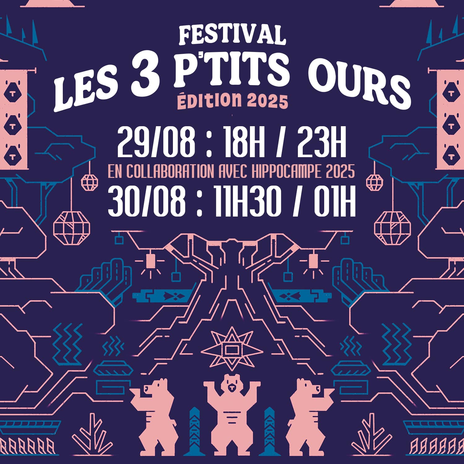 Les 3 P’tits Ours, c’est plus qu’un festival, c’est un lieu de vie et de culture ! On y découvre des spectacles de danse, de cirque, de stand-up, des concerts mémorables et des DJ set bouillants. On y profite d’une ambiance conviviale avec des jeux organisés tout au long de la journée. On y apprend des choses en se baladant dans notre village des associations et artisans et en découvrant nos animations autour des mobilités durables.