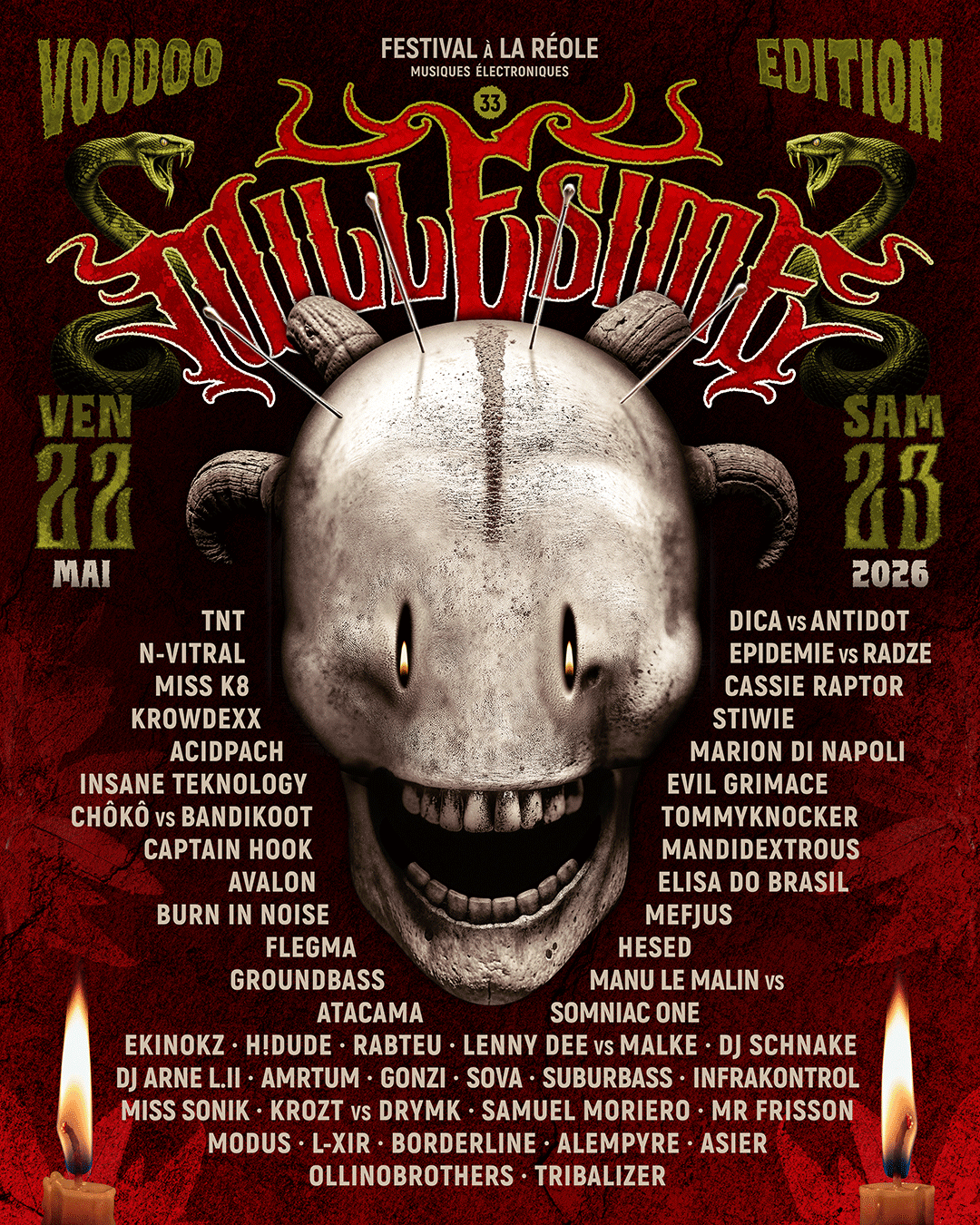 Niché entre Bordeaux et Toulouse, le long des berges de la Garonne, le Millésime Festival s’impose comme un rendez-vous incontournable des musiques électroniques dans le Sud-Ouest. Chaque année, La Réole accueille ce festival de musique 2026 qui transforme cette charmante commune girondine en véritable temple des sons électroniques le temps d’un week-end prolongé. Pour cette huitième édition programmée les 22, 23 et 24 mai, l’événement adopte un thème Voodoo particulièrement évocateur, promettant une expérience mystique et intense aux festivaliers.