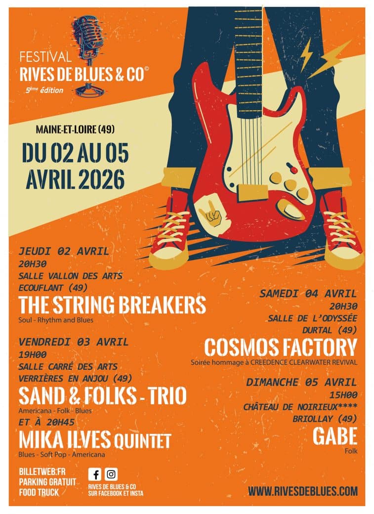 Avec cette édition 2026, Rives De Blues & Co confirme sa place parmi les rendez-vous incontournables du printemps en Maine-et-Loire. L’événement attire un public curieux et ouvert, désireux de découvrir des sons variés tout en profitant d’une programmation soigneusement sélectionnée. Le festival de musique 2026 à Écouflant reste fidèle à son objectif : proposer des concerts de grande qualité dans un cadre accueillant et accessible, tout en mettant en lumière la richesse des musiques folk, blues et americana.