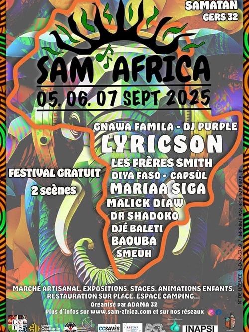 Le charme de Sam’Africa réside dans son ambiance chaleureuse, populaire et accessible. Ici, pas de blabla ni de folklore forcé : juste de la musique sincère, des rencontres, et une programmation qui mêle énergie, traditions vivantes et sons actuels. Pour cette édition 2025, le line-up promet de faire bouger les lignes et les corps. Lyricson, voix puissante du reggae international, partage la scène avec Diya Faso, qui puise dans les rythmes traditionnels du Burkina Faso pour les faire dialoguer avec les sons d’aujourd’hui. On retrouve aussi Gnawa Famila, groupe toulousain qui mêle trance gnawa, afrobeat et groove urbain avec une intensité communicative.